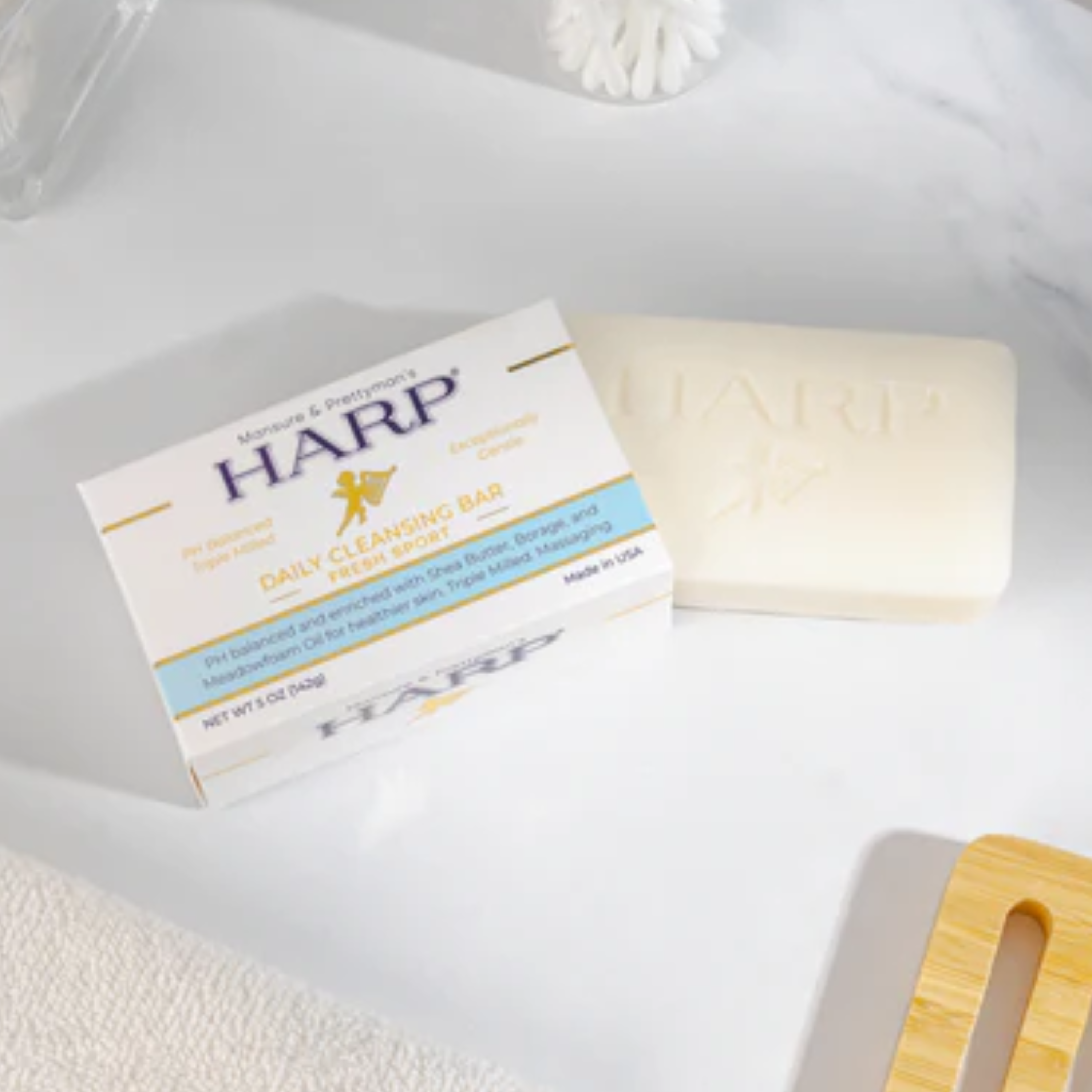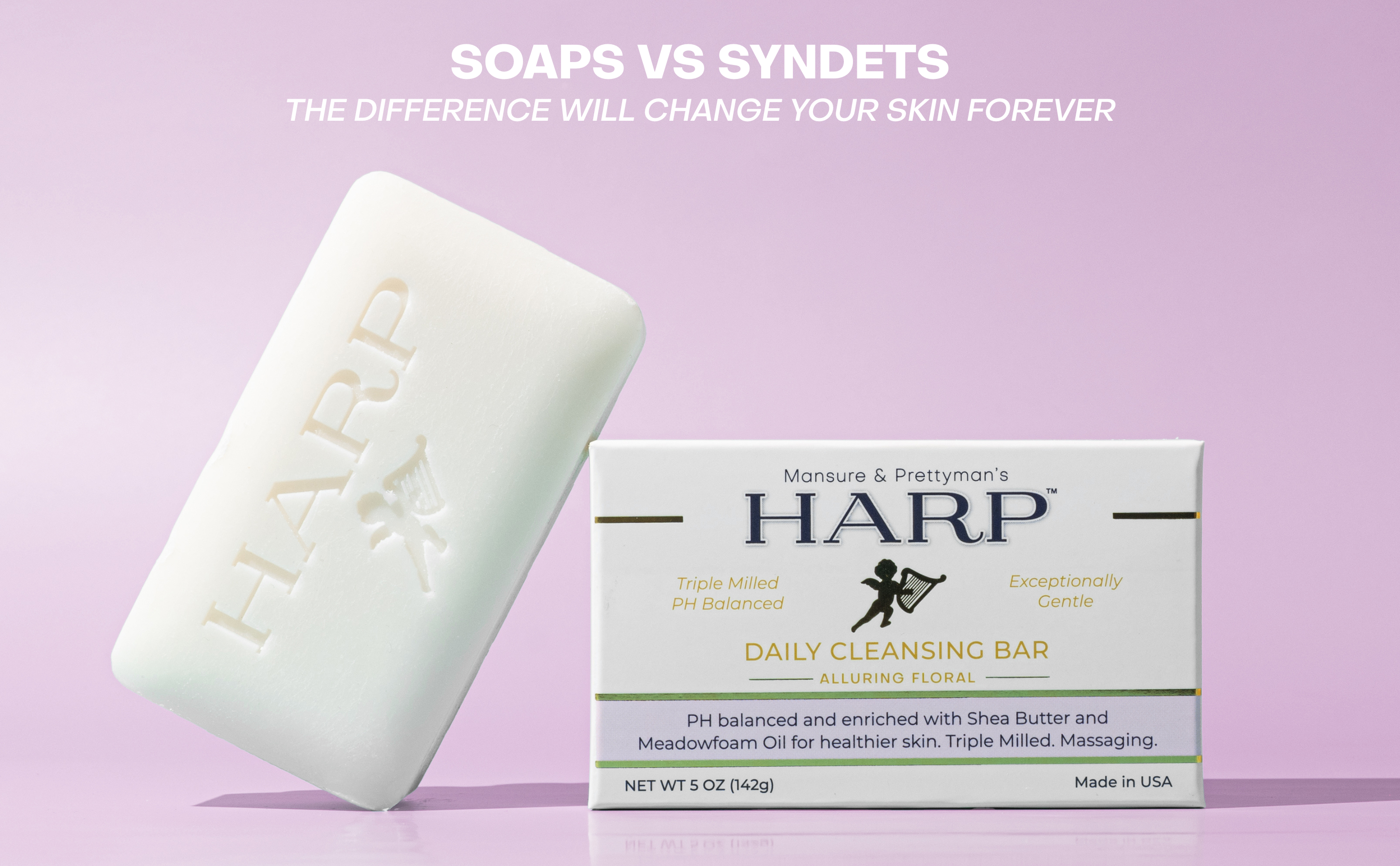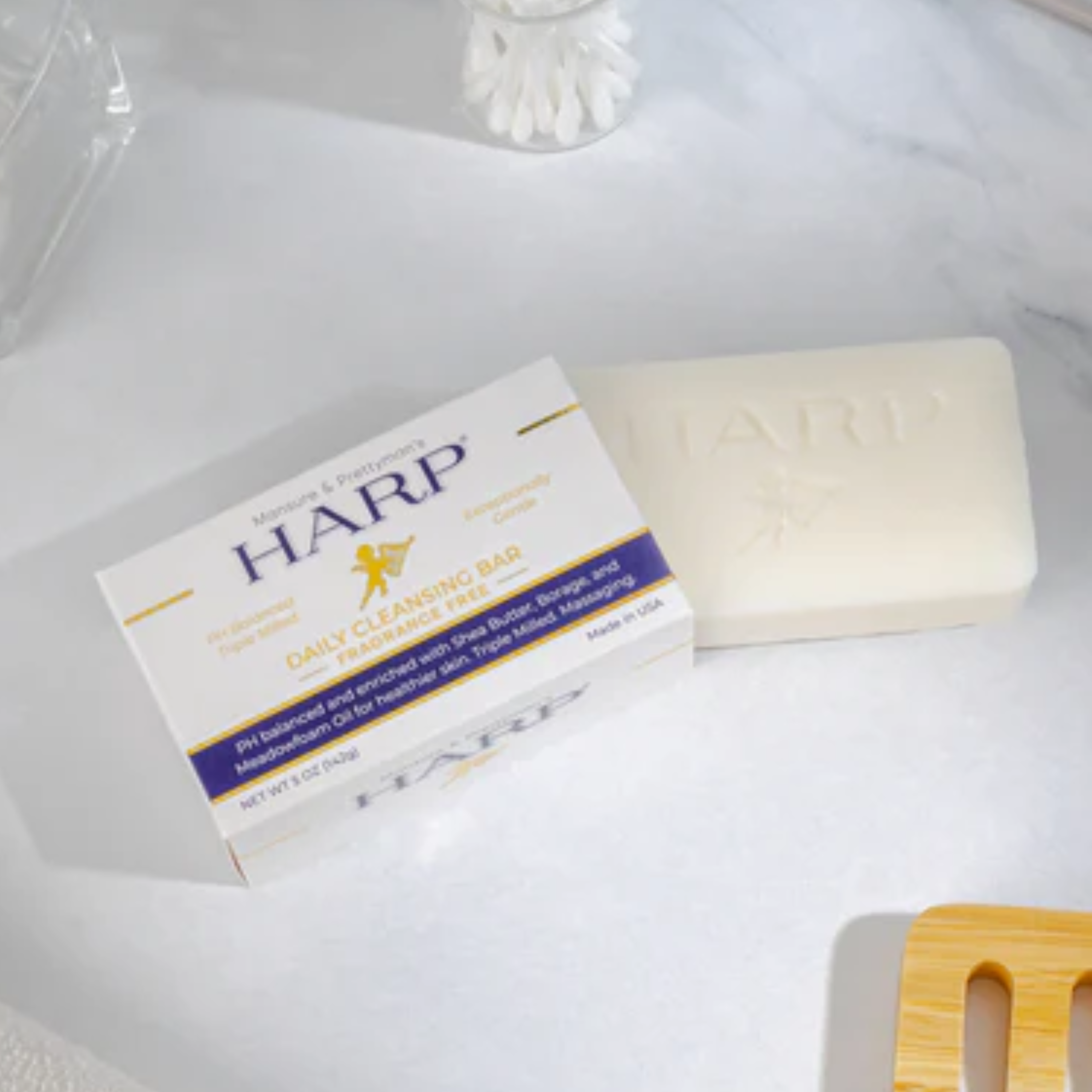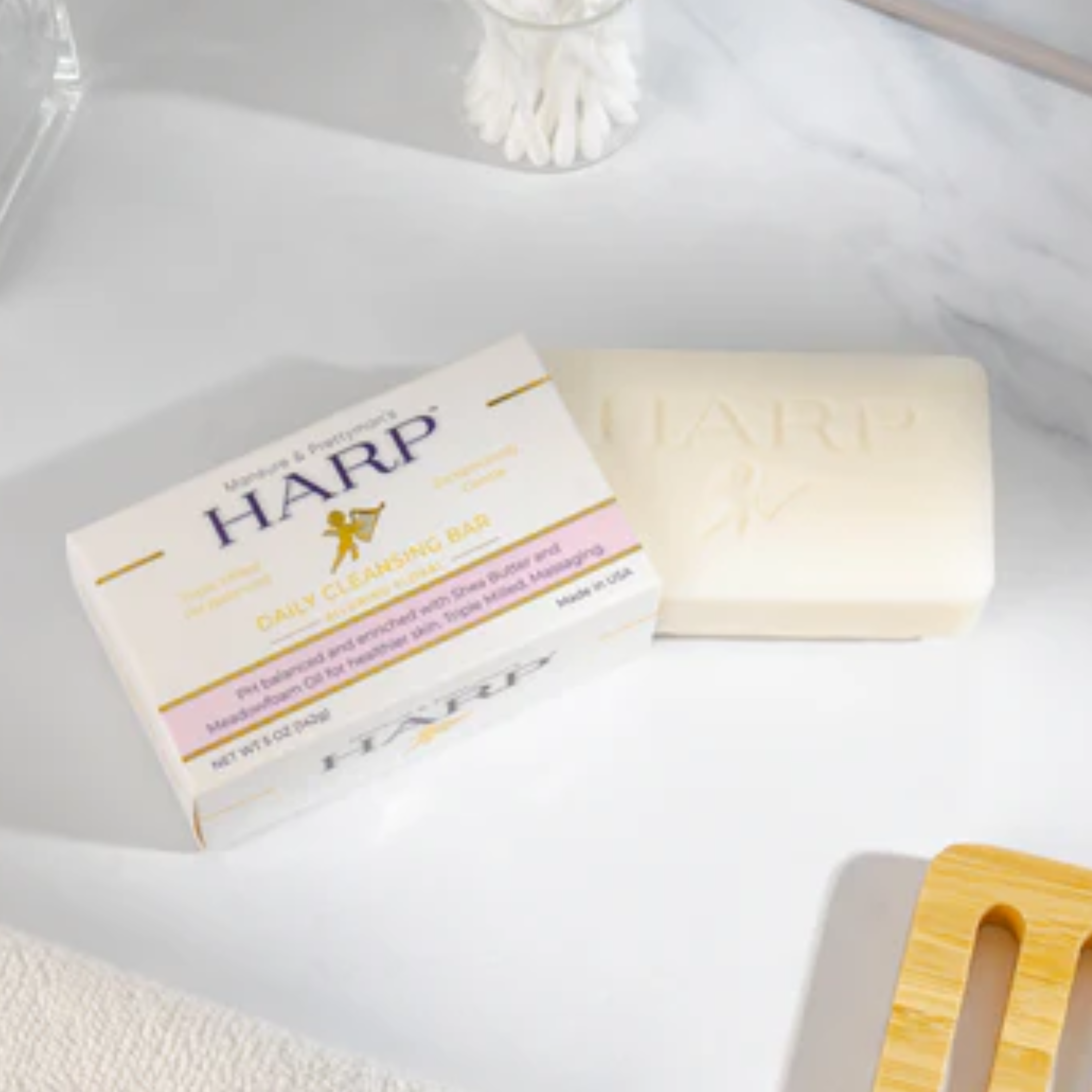 Our daily cleansing bar is a pH-balanced, soap-free, exceptionally gentle plus moisturizing syndet bar for the whole body. Harp soap is formulated with the highest quality cleansers on the market. We avoid using saponified oils and fats for our base cleanser such as Palm, Coconut, Olive oil, or goats milk - these products raise the pH level and therefore cause dryness.