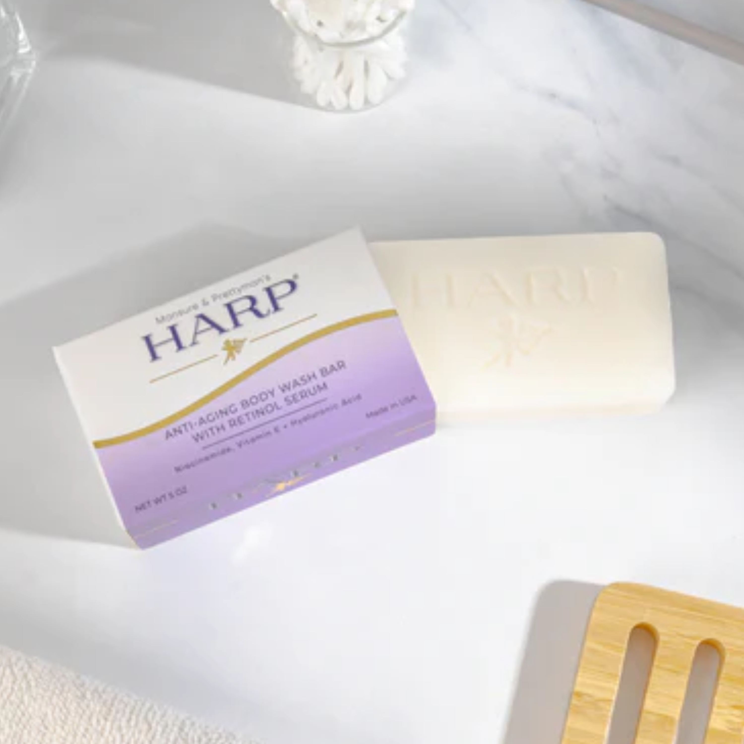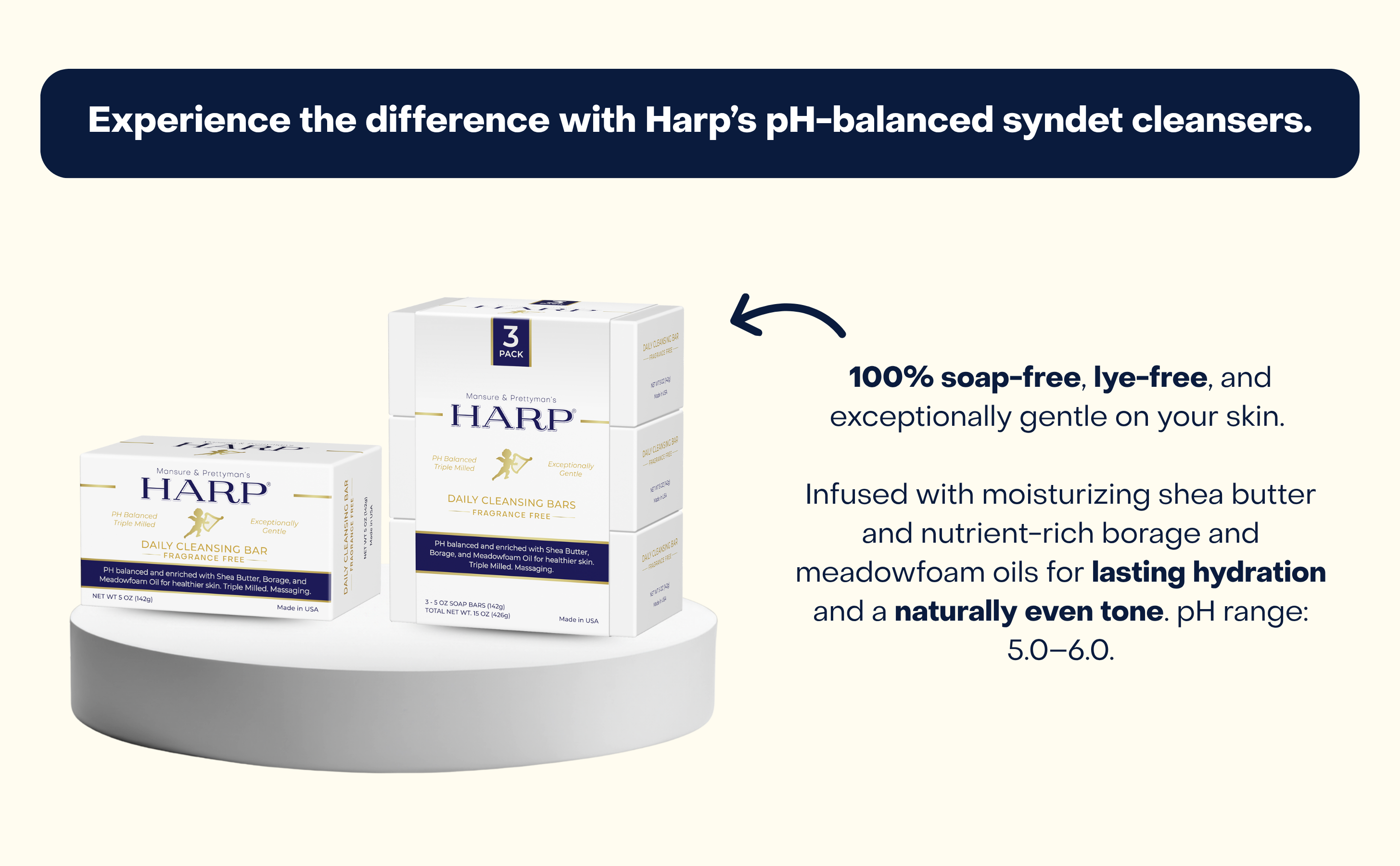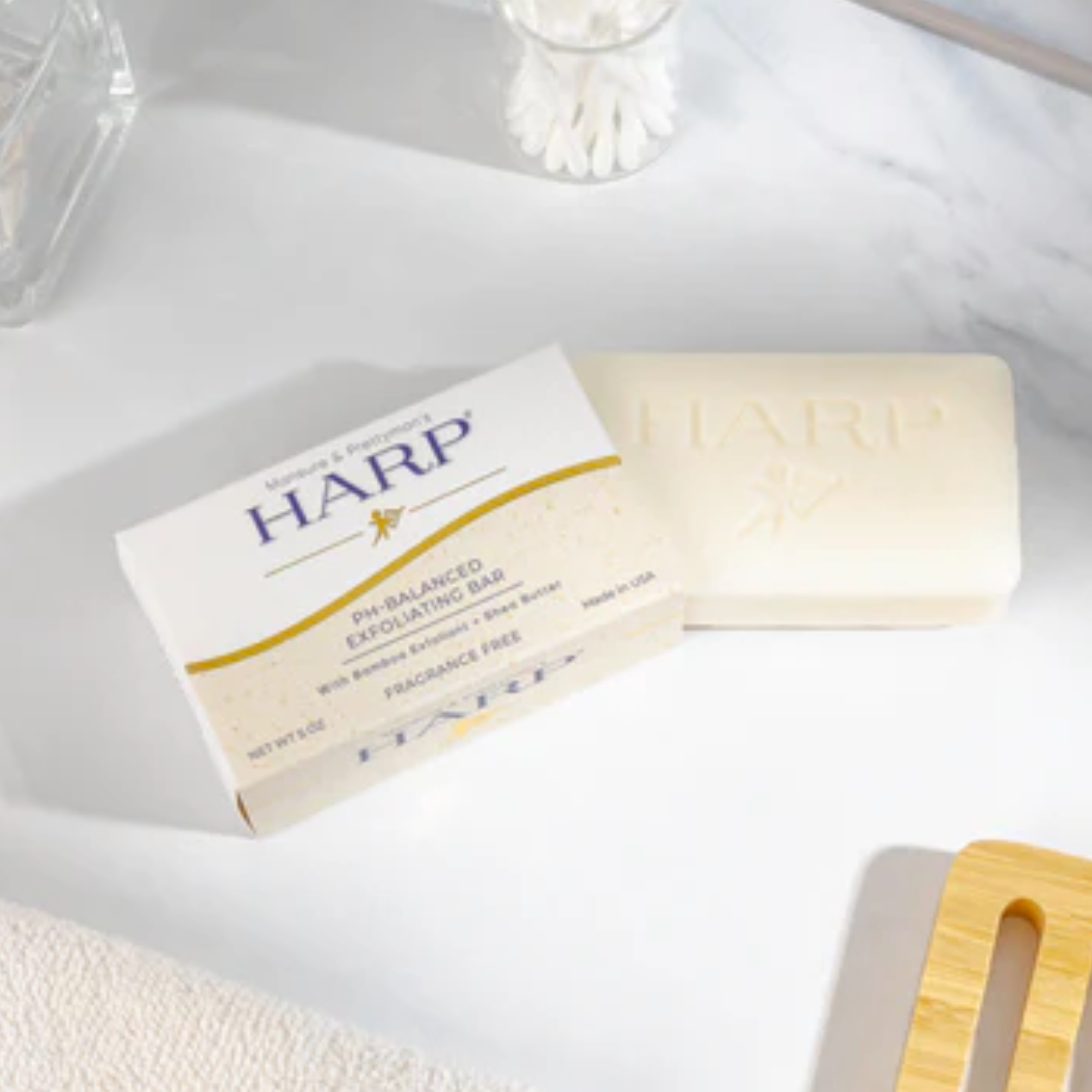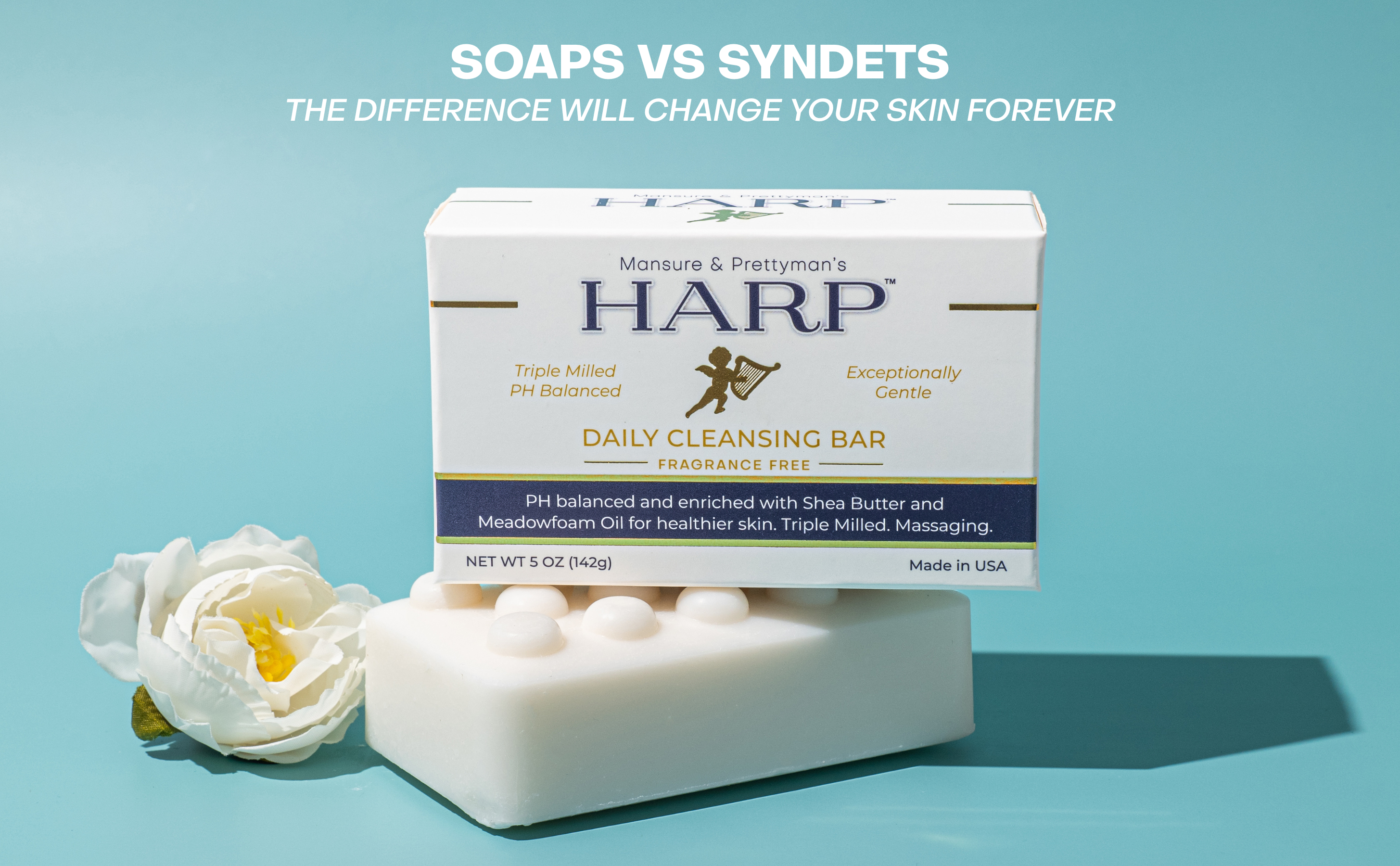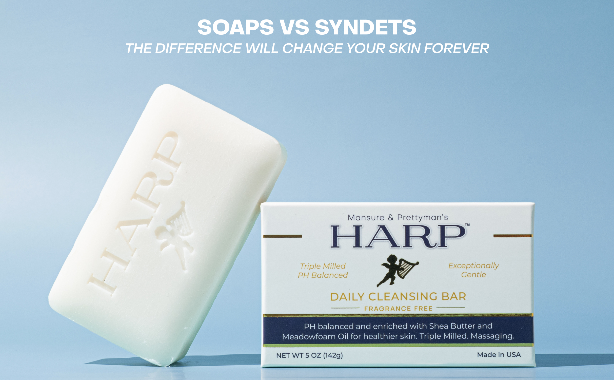 Our daily cleansing bar is a pH-balanced, soap-free, exceptionally gentle plus moisturizing syndet bar for the whole body. Harp soap is formulated with the highest quality cleansers on the market. We avoid using saponified oils and fats for our base cleanser such as Palm, Coconut, Olive oil, or goats milk - these products raise the pH level and therefore cause dryness.